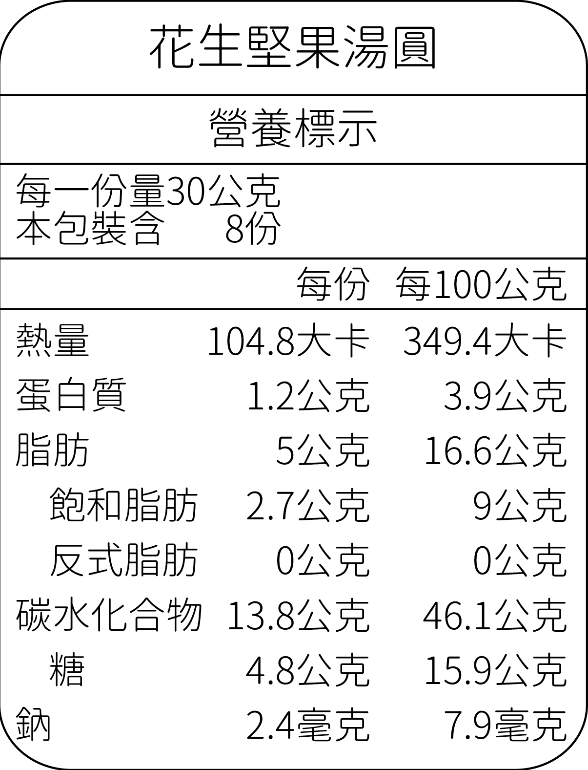 - 過敏原:本產品含有花生、堅果及其製品,不適合其過敏體質者食用。