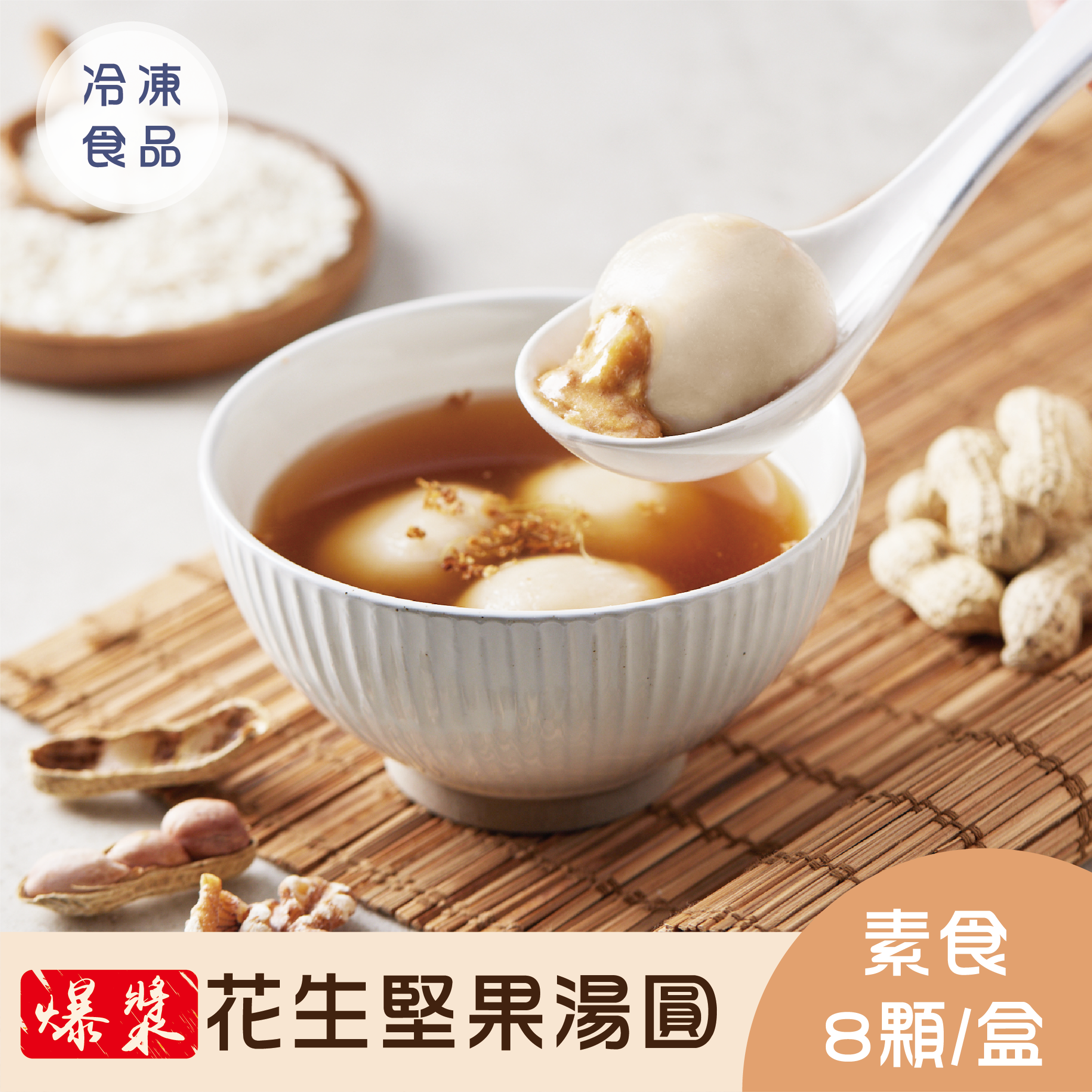 - 精心製作超口感爆漿流沙甜湯圓,外皮選用長糯米製作,Q嫩有彈性,再加入純花生粉/醬增加香氣與口感。