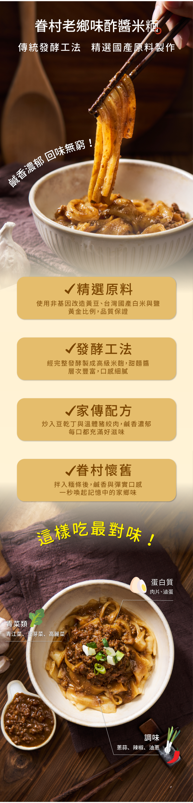 - 成分:米米糆:水、小麥澱粉、樹薯澱粉、玉米澱粉、乙醯化己二酸二澱粉、馬鈴薯澱粉、在來米粉、醋酸澱粉、大豆沙拉油、甜味劑(D-山梨醇液70%)、鹽、羧甲基纖維素鈉、三偏磷酸鈉、二氧化鈦(二氧化鈦、強化長鏈菊苣纖維)。醬包:皮蛋、大豆沙拉油、剝皮辣椒{水、剝皮辣椒(含氯化鈣)、非基因改造脫脂黃豆片胺基酸液、特級砂糖、調味劑(5’-次黃嘌呤核苷磷酸二鈉、5’-鳥嘌呤核苷磷酸二鈉)、品質改良劑(乳酸鈣)、甜味劑〔甘草素(含糊精、檸檬酸鈉)〕}、蔥、辣椒、糯米椒、香菜、水、辣椒粉、蒜、醬油、香菇素蠔油〔釀造生醬油(水、非基因改造脫脂黃豆片、小麥、食鹽)、水、轉化液糖(蔗糖、水)、粘稠劑(乙醯化己二酸二澱粉、玉米糖膠)、特級砂糖、酵母抽出物、防腐劑(已二烯酸鉀)、香菇粉(糊精、香菇抽出物)、香菇汁、甜味劑(甘草萃(含糊精、檸檬酸鈉))、食鹽、調味劑(DL-蘋果酸) 〕、糖、香油(大豆沙拉油、芝麻油)、青花椒粉、鹽、芝麻油、黑胡椒粉〔黑胡椒、綠辣椒、茶枝、品質改良劑(磷酸鈣)〕。醬油膏:{水、黃豆汁〔水、黃豆(基因改造)〕、食鹽、澱粉(乙醯化己二酸二澱粉)、蔗糖、焦糖色素、玉米澱粉、苯甲酸(防腐劑)、檸檬酸、甜味劑〔AK糖(醋磺內酯鉀)〕、5’-鳥嘌呤核苷磷酸二鈉、5’-次黃嘌呤核苷磷酸二鈉、甜味劑(甘草萃)、胺基乙酸、甜味劑〔蔗糖素、紐甜(紐甜、麥芽糊精)〕、琥珀酸二鈉、玉桂}。