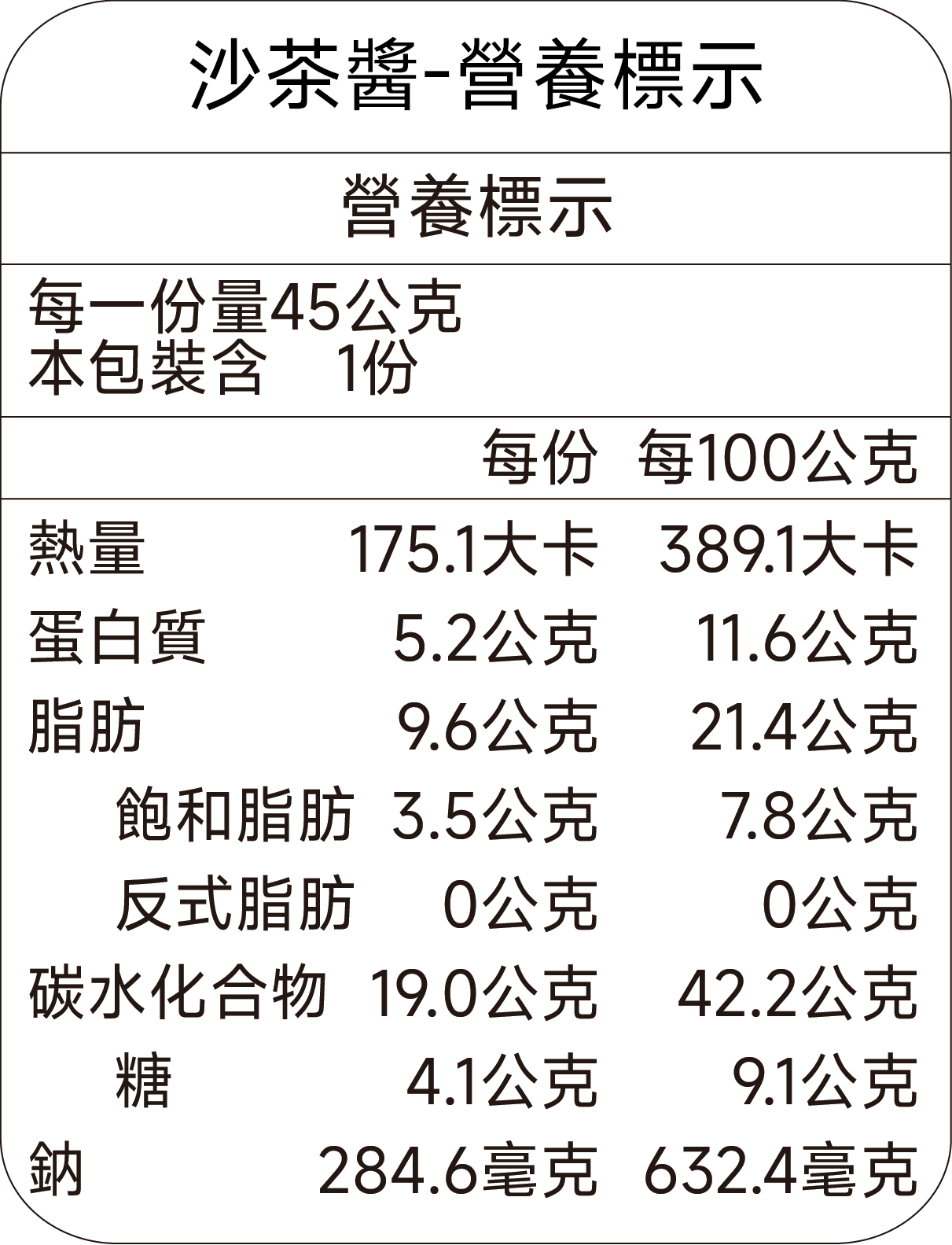 沙茶醬:大豆沙拉油、蝦米、金勾蝦、糖、花生粉、紅蔥頭、洋蔥、醬油、芝麻醬(芝麻、黃豆油)、特級胡椒粉〔麩皮粉、麥芽糊精、綠辣椒、胡椒、玉米澱粉、雞心椒、茶枝、八角、當歸〕、沙茶醬(大豆沙拉油、魚乾、南薑粉、蒜頭、椰子粉、蔥乾、芝麻、食鹽、赤尾青、辣椒粉、咖哩粉、胡椒)、香油(大豆沙拉油、芝麻油)。