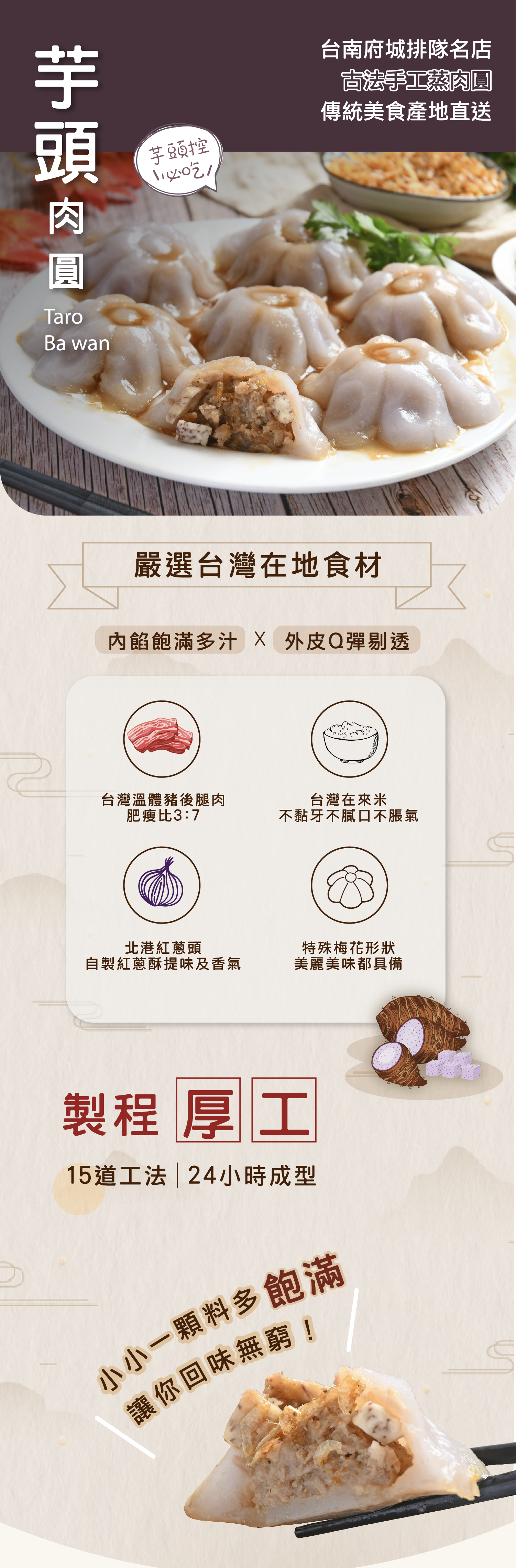 - 成分: 豬肉、水、芋頭塊、肉圓粉(磷酸化磷酸二澱粉、辛烯基丁二酸鈉澱粉、磷酸二澱粉、樹薯澱粉、丁二酸鈉澱粉)、醬油、在來米粉(在來米粉、玉米澱粉)、蔥頭酥(蔥頭、棕櫚油、玉米澱粉)、大豆沙拉油、糖、蝦皮、鹽、美力香味料(味精、琥珀酸二鈉、5’-次黃嘌呤核苷磷酸二鈉、5’-鳥嘌呤核苷磷酸二鈉、DL-胺基丙酸)、胡椒粉(麩皮粉、麥芽糊精、綠辣椒、胡椒、玉米澱粉、雞心椒、八角、當歸)、健美鮮(鹽、L-天門冬酸鈉、胺基乙酸、DL-胺基丙酸、5’-次黃嘌呤核苷磷酸二鈉、5’-鳥嘌呤核苷磷酸二鈉、琥珀酸二鈉)、雞粉〔鹽、麥芽糊精、L-麩酸鈉、糖、玉米澱粉、雞肉粉、香料、酵母萃取物、雞油、棕櫚油、調味劑(5’-次黃嘌呤核苷磷酸二鈉、5’-鳥嘌呤核苷磷酸二鈉)、白胡椒〕、保良久(多磷酸鈉、焦磷酸鈉、焦磷酸鉀)、清香粉(肉桂粉、大茴香粉、丁香粉、小茴香粉、花椒粉、甘松粉)、烤肉粉〔糖、檸檬酸鈉、味精、水解動物蛋白(魚)、鹽、DL-胺基丙酸、肉桂粉、琥珀酸二鈉、香料、5’-次黃嘌呤核苷磷酸二鈉、5’-鳥嘌呤核苷磷酸二鈉、玉米糖膠、甘草酸鈉(甜味劑)、大茴香粉、山奈粉、小茴香粉、甘草粉、川芎粉、花椒粉、薑粉、丁香粉、大豆水解蛋白〕、小蘇打、水解動物蛋白(魚)。